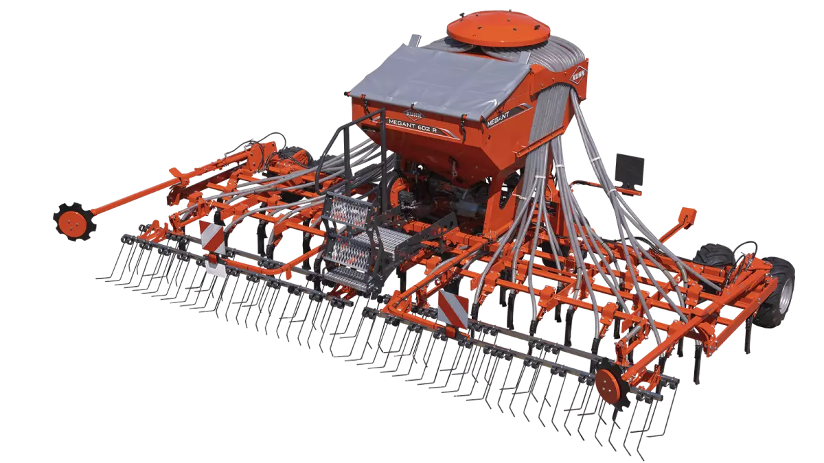 Con anchuras de trabajo de 6,00, 7,20 y 8,00 metros, las sembradoras MEGANT ofrecen una elevada productividad. Su tolva, con una capacidad de 1800 litros, puede contener hasta 1200 kg de trigo para lograr una autonomía máxima. El cabezal de distribución y las tuberías de descenso de las semillas están situadas en el exterior de la tolva. La capacidad de la tolva corresponde, por tanto, al volumen real de semillas que puede cargarse.