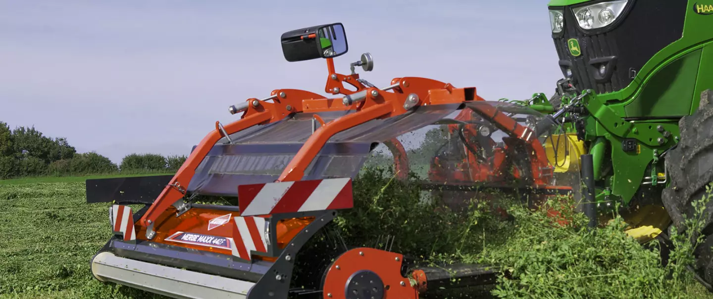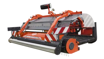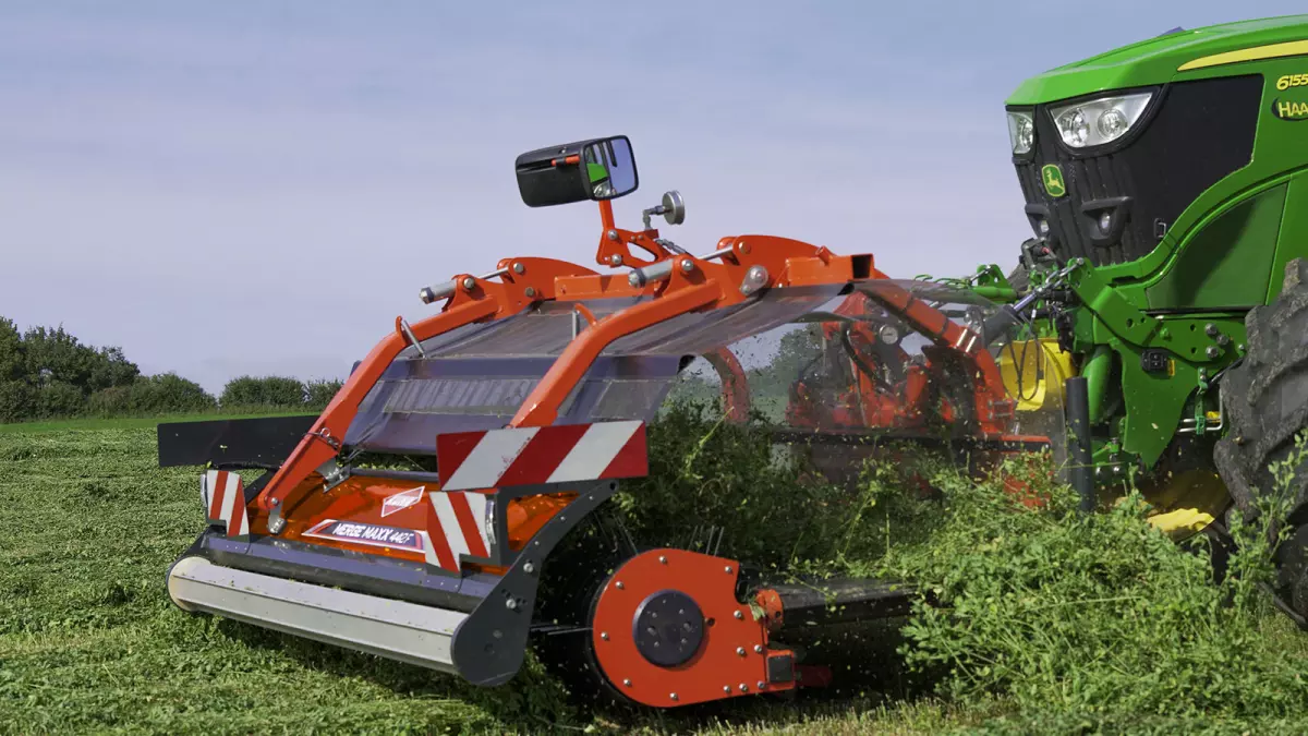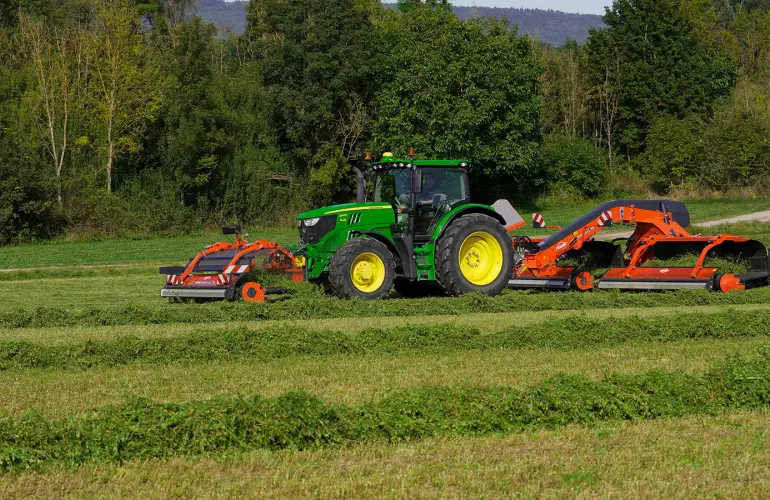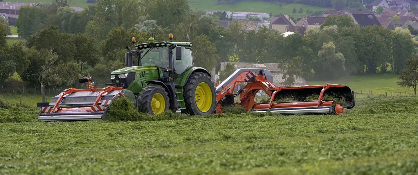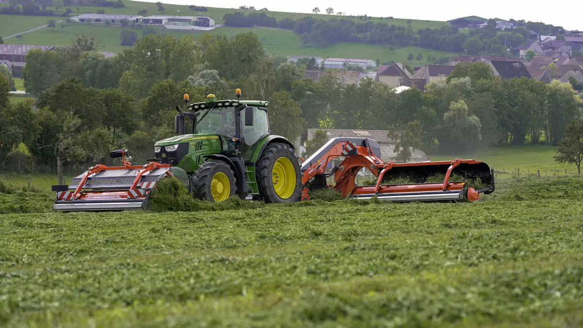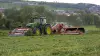 La exclusiva doble cinta del modelo MERGE MAXX 442 F permite al usuario distribuir el mismo volumen de forraje a cada lado. Este accesorio delantero también evita que el forraje sea compactado por las ruedas del tractor.