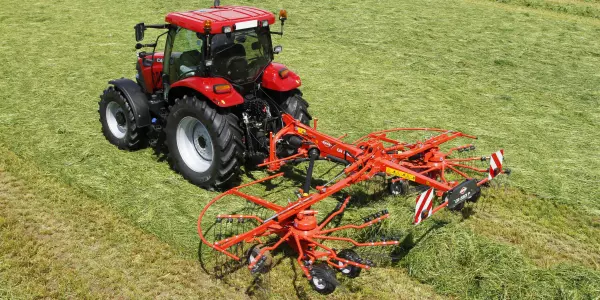 El hilerador de doble rotor suspendido GA 6501 P descarga el forraje en una hilera central. Trabaja en una anchura de 5,65 m a 6,40 m. La calidad del rastrillado es impresionante y produce hileras con una forma perfecta para conseguir un secado rápido.