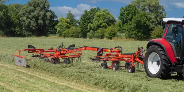 El hilerador de doble rotor GA 6002, con descarga lateral, trabaja en una anchura de 3,50 m a 5,80 m y produce una o dos hileras. Esta máquina se puede utilizar sin problemas con un tractor de potencia baja o media.