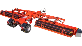 Las cintas de gran anchura con velocidad regulable permiten agrupar el forraje en una hilera de aprox. 1,80 m a 3,00 m de ancho. Además, pueden elevarse para depositar el forraje en toda la anchura.