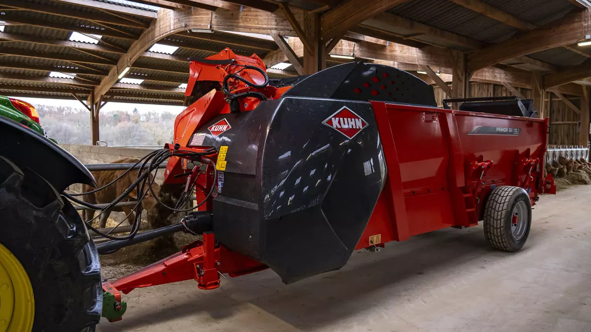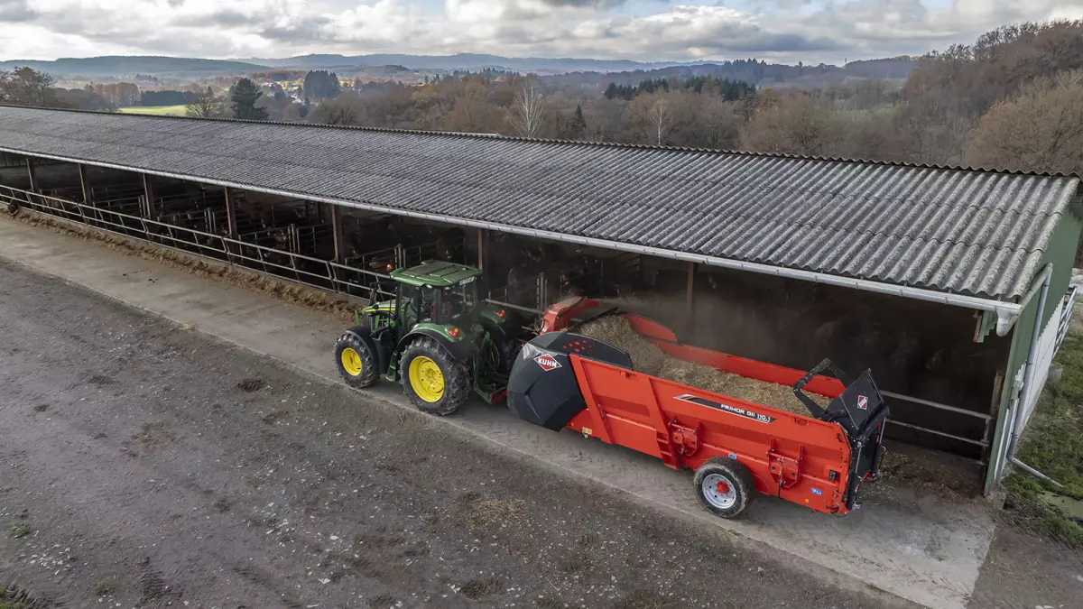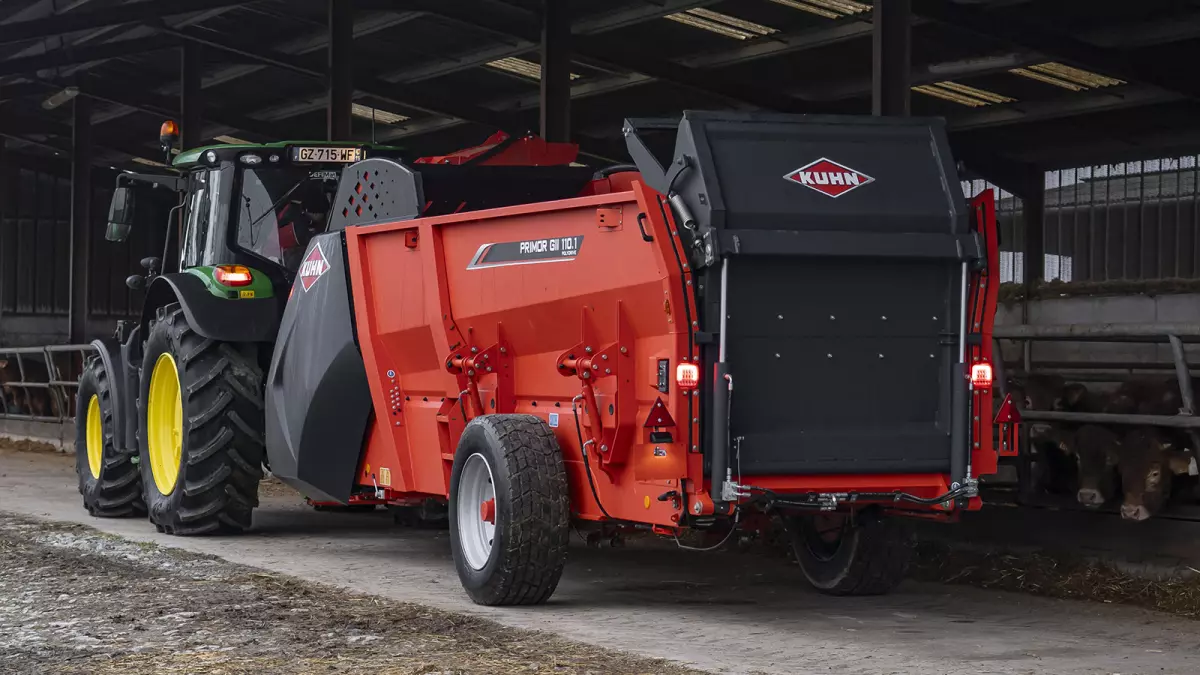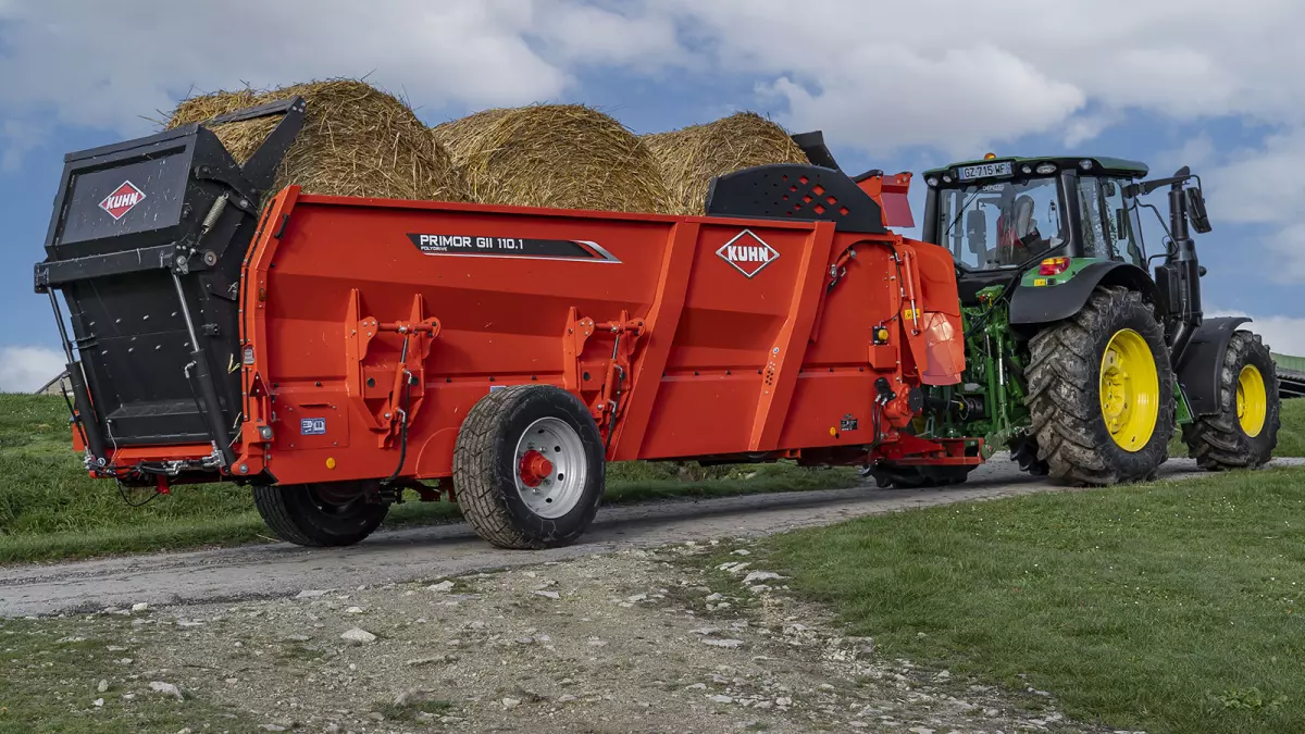 En la categoría de las empajadoras distribuidoras de más de 10 m³, la PRIMOR GII 110.1 Polydrive se ha diseñado para disponer de unas dimensiones exclusivas. Poder alojar 2 pacas cúbicas de 2,70 m con el portón trasero cerrado, así como 4 pacas redondas de 1,80 m: gracias a su tolva de 5,50 m de longitud detrás del rotor. Su altura de 2,67 m ofrece al usuario la mejor visibilidad del mercado, al tiempo que le permite entrar en los edificios más bajos.