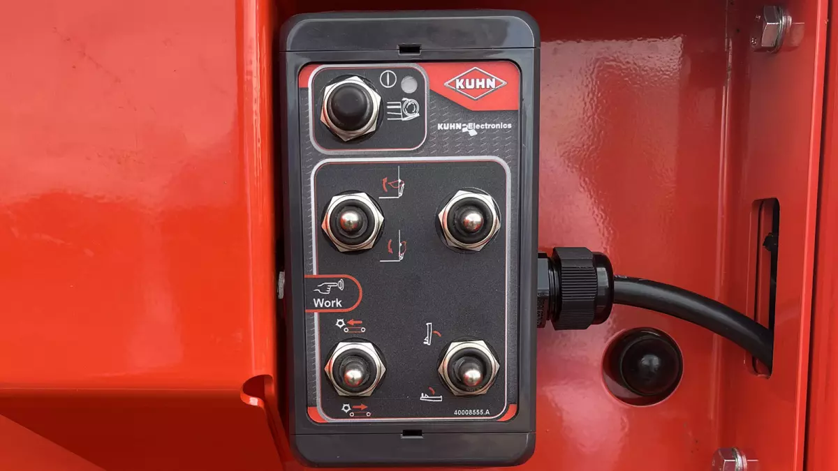 El dispositivo opcional patentado UNROLL SYSTEM garantiza un uso óptimo de estas grandes máquinas cuando se utilizan varias pacas redondas. Disponible en todas las grandes empajadoras distribuidoras KUHN PRIMOR, el sistema está compuesto por dos pinzas hidráulicas en la tolva que bloquean las pacas que están a la espera. La primera paca en proceso de distribución se desenrolla sin esfuerzo ni la presión de las pacas en espera, que a menudo obligan a los usuarios a realizar maniobras de avance y retroceso con la cinta. Tras el paso de la paca en proceso de distribución, el usuario libera las pacas en espera para continuar con la distribución o el empajado. La ventaja del dispositivo UNROLL SYSTEM es la posibilidad de levantar las pacas en espera en la tolva y poder retirar fácilmente las cuerdas o las mallas, sin esfuerzo.
